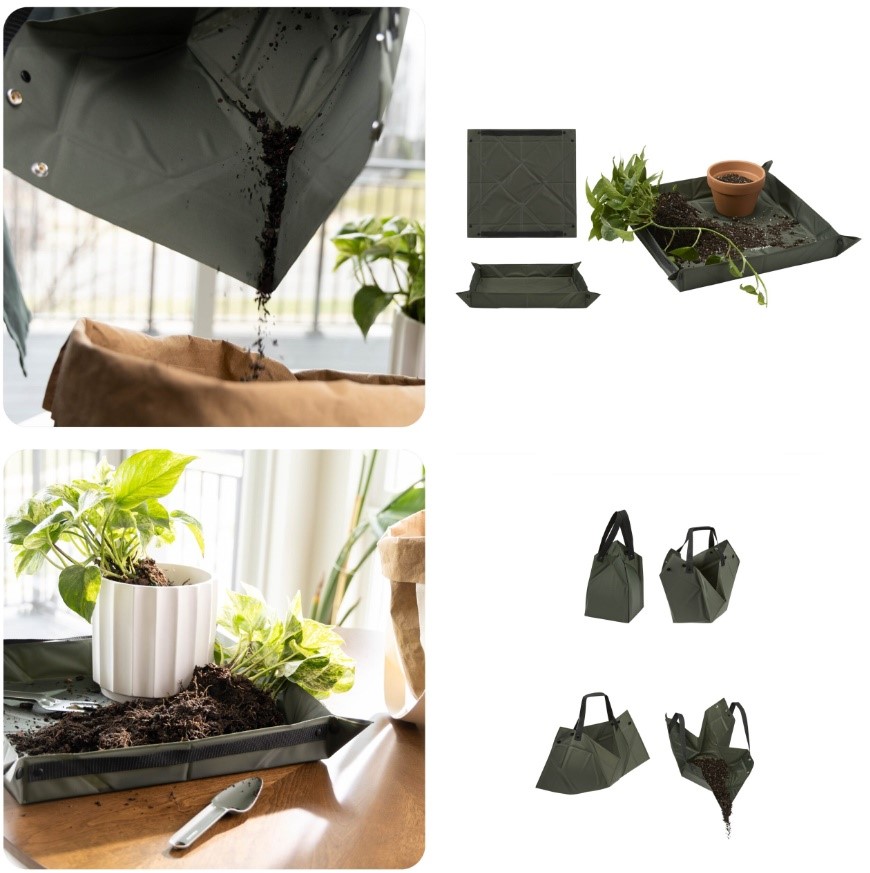 Mata została wykonana z trwałego, wodoodpornego materiału, który zapobiega przenikaniu wilgoci i ułatwia utrzymanie czystości. Dzięki specjalnej konstrukcji z podwyższonymi, zapinanymi rogami tworzy praktyczną przestrzeń roboczą, która zatrzymuje rozsypaną ziemię i resztki roślin w jednym miejscu. Po zakończeniu pracy matę można łatwo złożyć, pozwalając na wygodne przechowywanie nawet w niewielkich przestrzeniach.