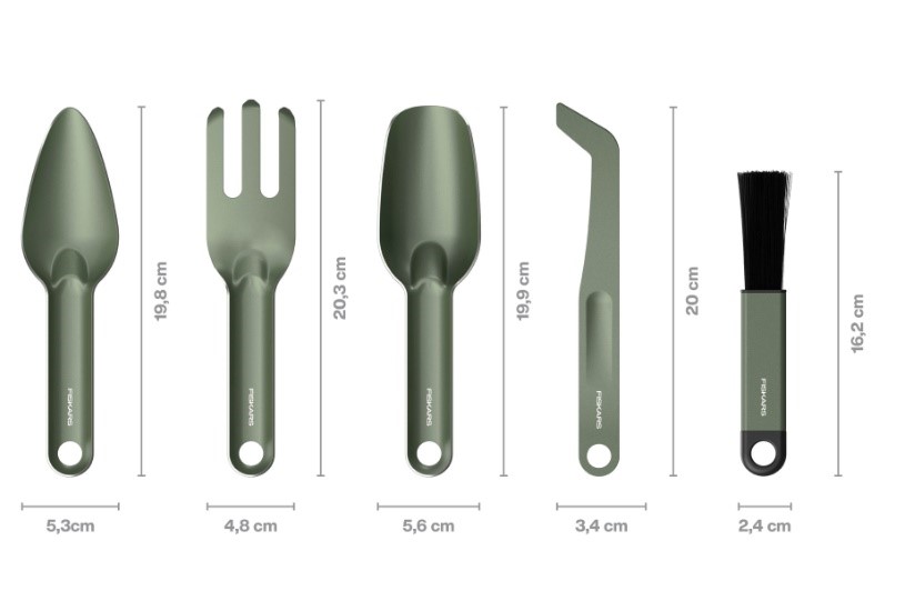 W zestawie znajduje się pięć starannie zaprojektowanych narzędzi: ostra łopatka idealna do pracy w twardszym podłożu, szeroka łopatka do nabierania i przenoszenia ziemi, gracka do spulchniania i wyrównywania gleby, pędzelek ułatwiający usuwanie resztek ziemi z liści i powierzchni wokół roślin oraz pęseta, który doskonale sprawdza się przy, rozdzielaniu korzeni czy precyzyjnych pracach pielęgnacyjnych.