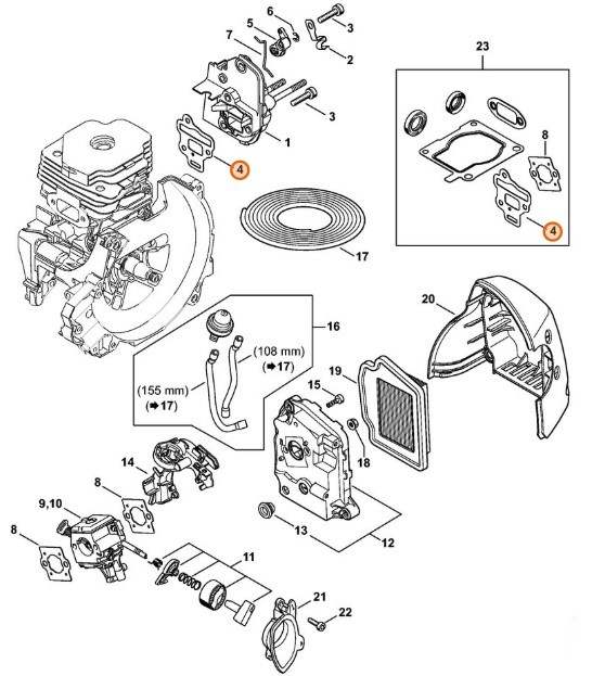 Wysokiej jakości oryginalna uszczelka do urządzeń STIHL: FS 510 C-EM, FS 561 C-EM, FS 560 C-EM, FS 491 C-EM, FS 561 C-EM, FS 490 C-EM, FS 491 C-EM.